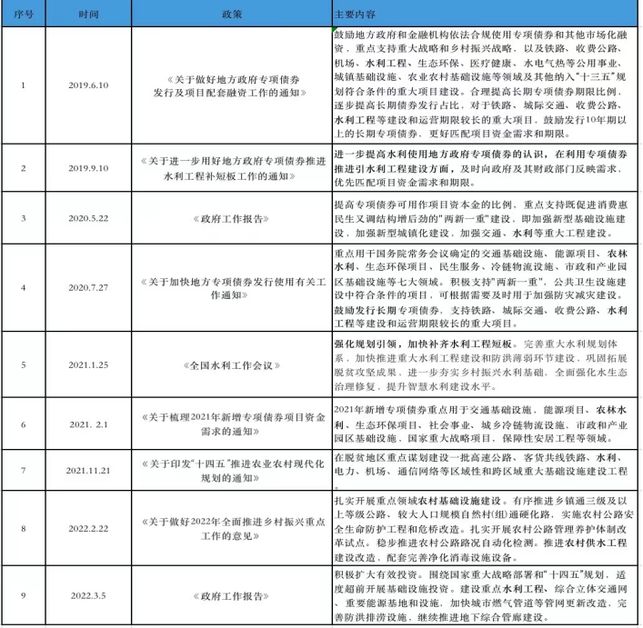 地方政府專項債券水利類工程主要支持水庫工程、引調(diào)水工程、城鄉(xiāng)供水一體化工程、結(jié)合供水的灌區(qū)工程4類,要求具備供水、發(fā)電等一定收益能力的項目。暫不支持江河湖泊治理、水生態(tài)治理與保護(hù)修復(fù)、節(jié)水灌溉、僅有灌溉的灌區(qū)、農(nóng)村飲水安全工程等水利工程項目。