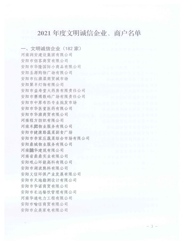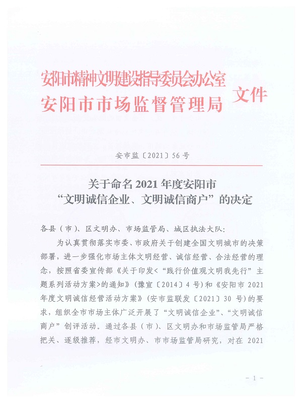 近日,安陽市市場監(jiān)督管理局、安陽市精神文明建設(shè)指導(dǎo)委員會(huì)辦公室聯(lián)合印發(fā)了2021年度安陽市“文明誠信企業(yè)、文明誠信商戶”的決定(安市監(jiān)[2021]56號(hào)),我公司榮獲2021年度安陽市“文明誠信企業(yè)”榮譽(yù)稱號(hào)。